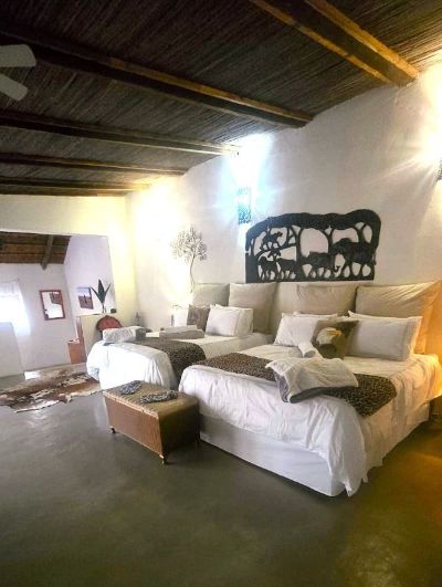 A large secluded room with 2 queen beds, set on a large sun terrace overlooking the wild area and the rock face, traditionally appointed with a simple modern style with a colonial influence, with a fireplace and a large luxury ensuite bathroom with a bath and a double shower. A true African experience. Sleeps up to 4. There is a fridge, coffee making facilities and full Wi-Fi.